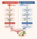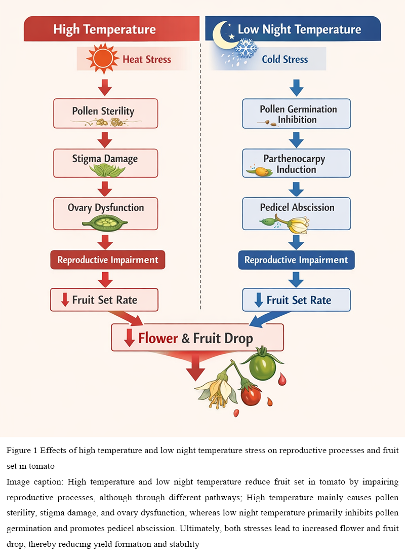Figure 1 Effects of high temperature and low night temperature stress on reproductive processes and fruit set in tomato Image caption: High temperature and low night temperature reduce fruit set in tomato by impairing reproductive processes, although through different pathways; High temperature mainly causes pollen sterility, stigma damage, and ovary dysfunction, whereas low night temperature primarily inhibits pollen germination and promotes pedicel abscission. Ultimately, both stresses lead to increased flower and fruit drop, thereby reducing yield formation and stability |